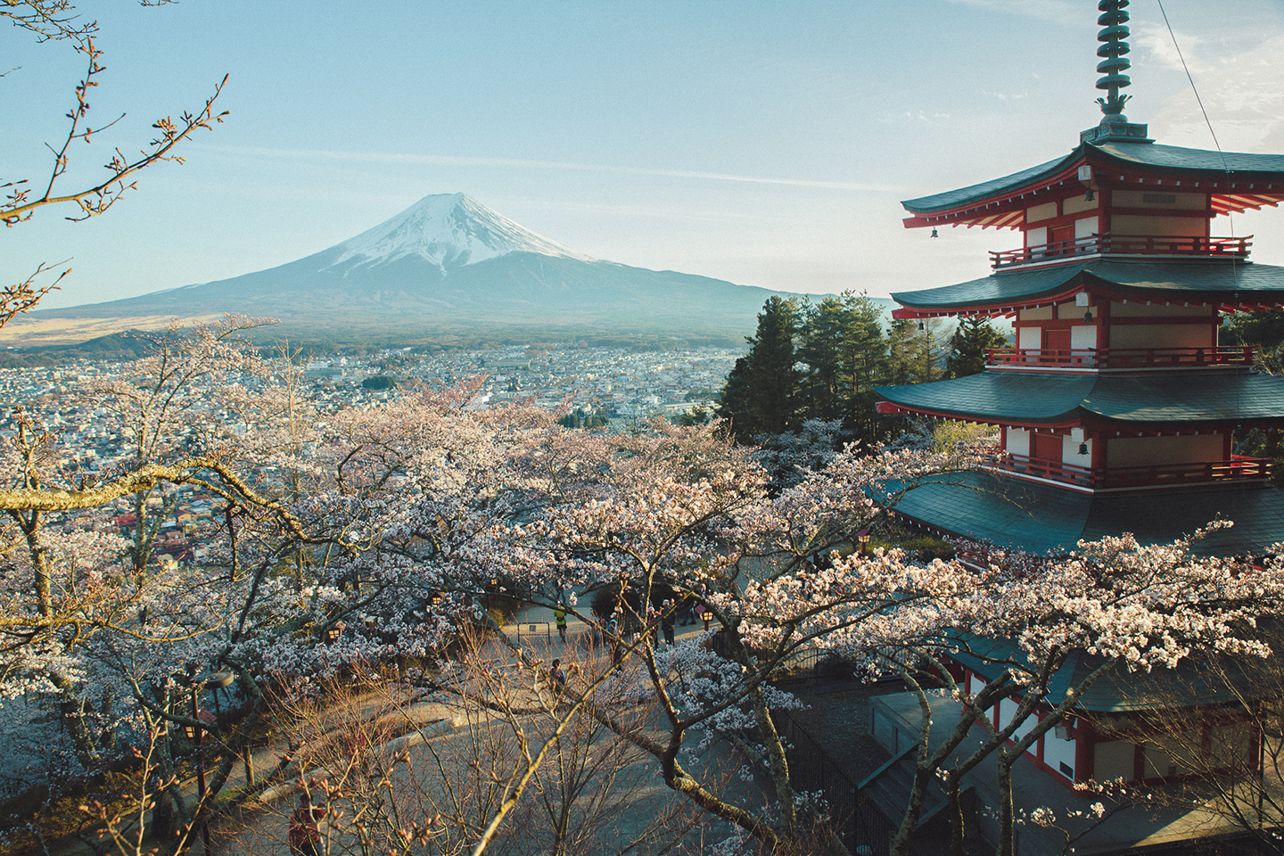 富士山と桜と街が一望できる忠霊塔からの景色を眺め、そこから約50分で山頂までいくことができます。